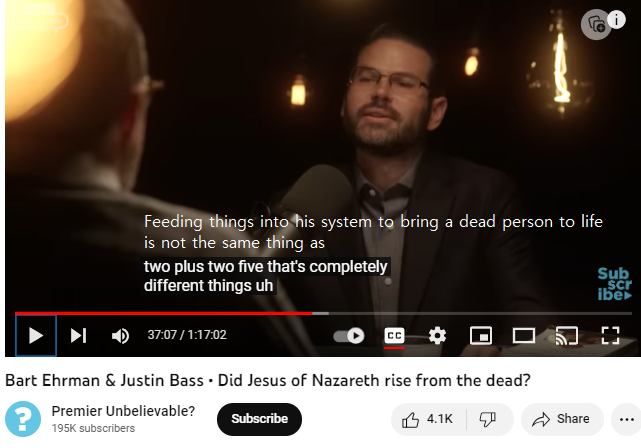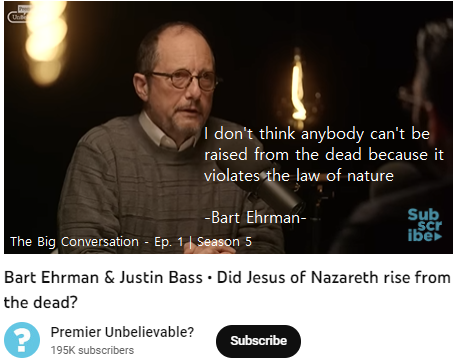 바트 어만의 비평을 하나하나 변론하는 것도 가능하지만 굉장한 분량이 됐을 겁니다. 하지만 우연히 4개월 전 바트 어만이 출연한 영국의 크리스천 라디오쇼 '프리미어 언빌리버블(Premier Unbelievable?)의 토론에서 지금까지 들어본 적이 없었던 '예수의 부활을 믿을 수 없는 이유'를 접하게 되었습니다.