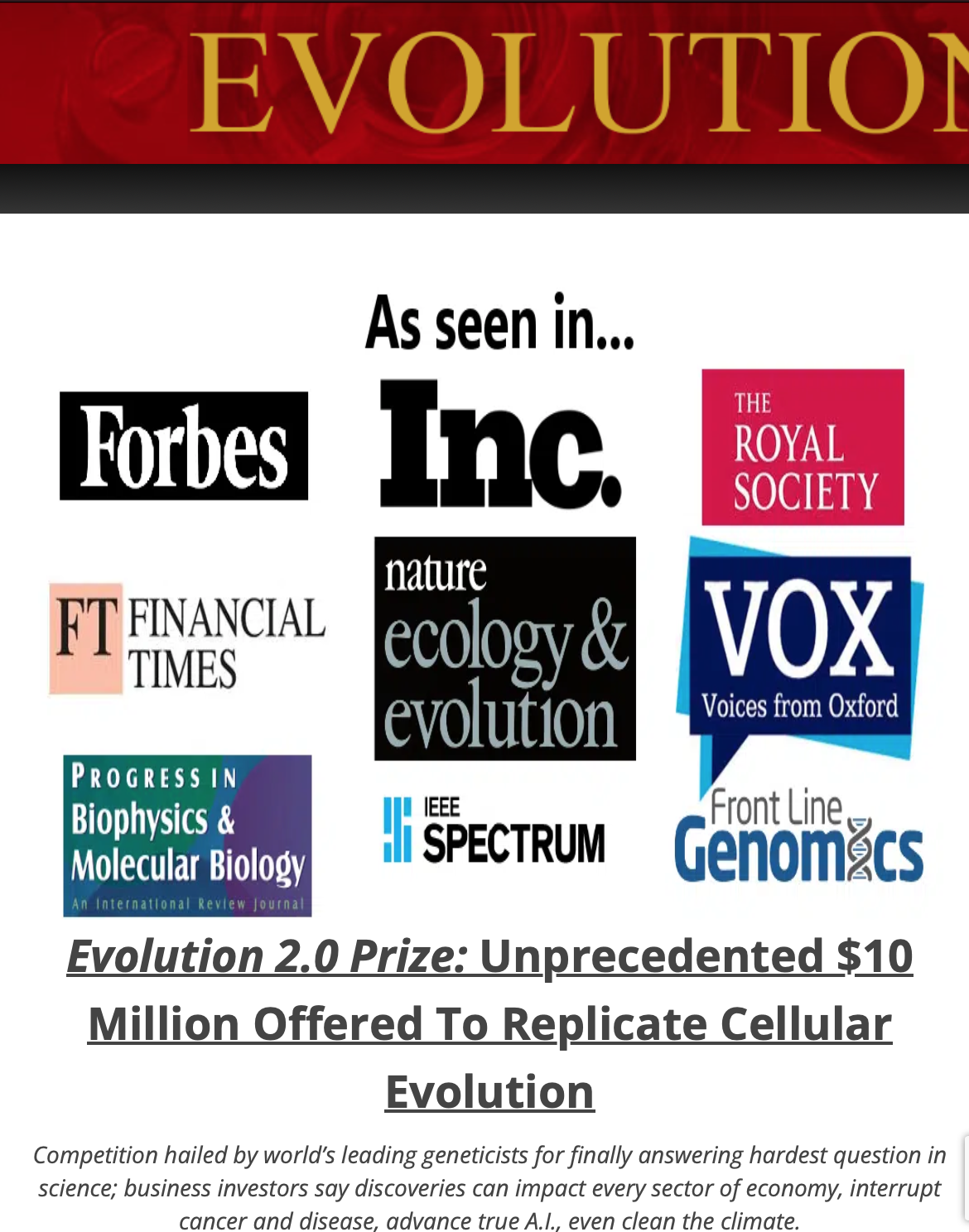 2019년, 100만 달러(약 1336.7억원/환율1,334.6), 노벨상의 10배의 상금이 걸린 Evolution 2.0 Prize (진화 2.0 상금)가 언론의 주목을 받습니다.