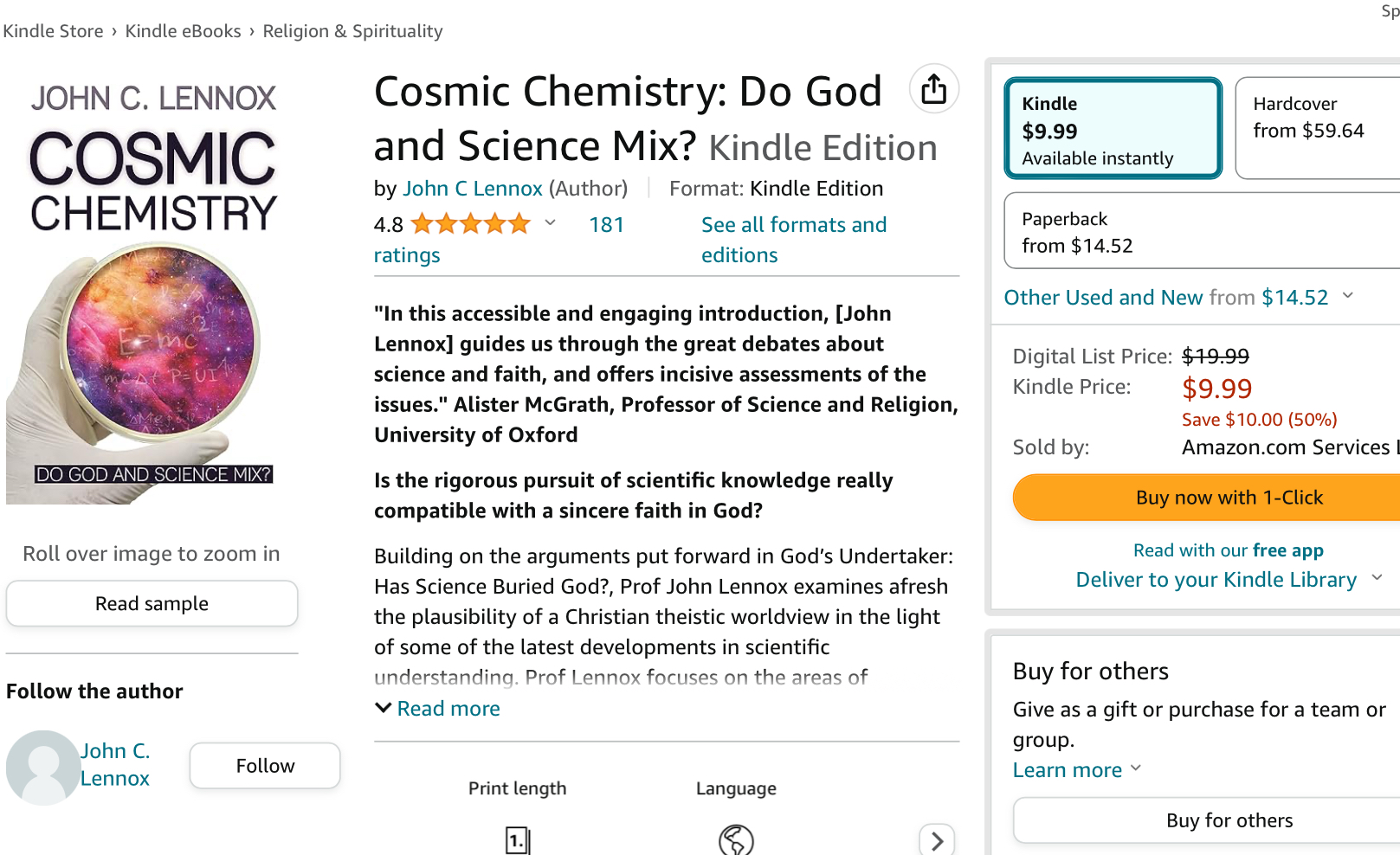 P.S= 이 주제에 대해 보다 깊이 알고 싶은 분들은 위 언급된 과학자들의 책을 읽어보시는 걸 추천 드립니다. 좀 더 포괄적으로 이해하고 싶으신 분들은 존 레녹스 교수의 아래 책 Cosmic Chemistry: Do God and Science Mix? 를 추천 드립니다. 전 클릭했을 때 마침 할인을 해서 충동구매를 해서 킨들에 추가 되었네요.