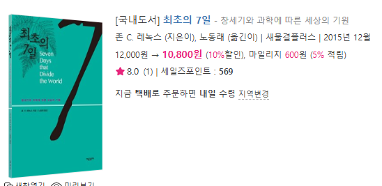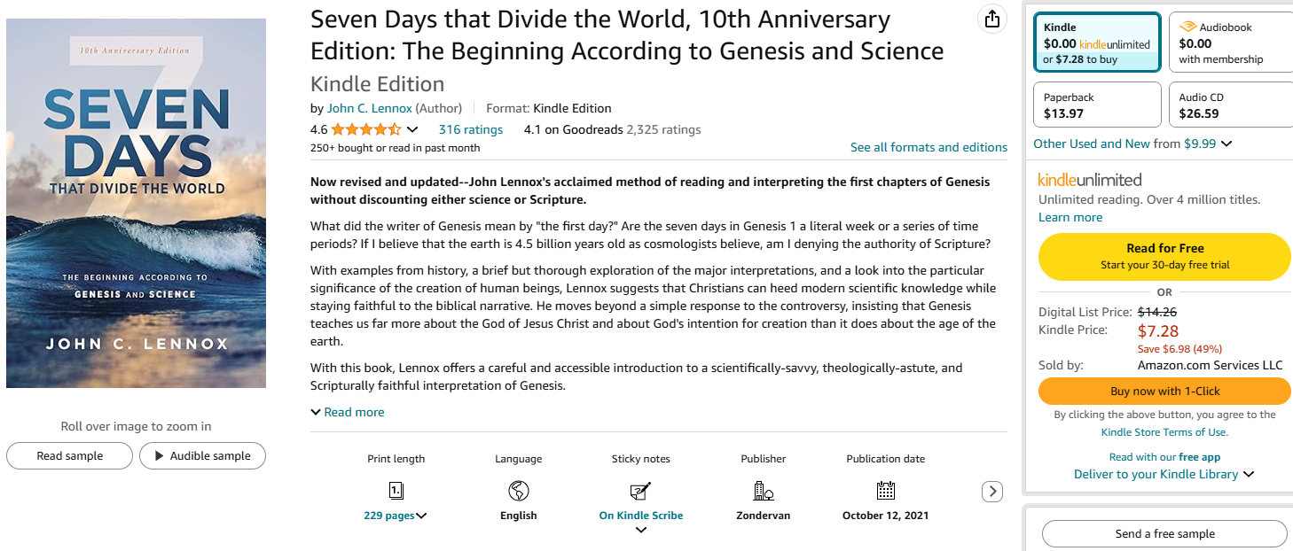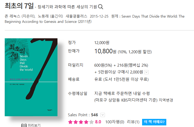 존 레녹스 교수가 이 주제에 대해 진행한 다른 여러 강의도 있지만, 저 정도 길이가 적당한 것 같아 짧은 버전으로 사용했습니다. 그는 이 주제에 대해 책을 쓴 바 있고, 이 책의 한국어 번역판도 출판되어 있으니 이 주제에 대해 보다 상세하게 알아보시고 싶으신 분은 ’최초의 7일‘ 을 구매하시거나 대여에서 읽어보시면 좋을 것 같습니다.