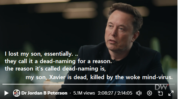 이런 상황에서 캐나다의 임상심리학자이자 작가인 조던 피터슨이 진행한 일론 머스크와의 인터뷰를 통해 일론 머스크의 아들 자비에르(Xavier)는 성전환수술 거쳐 ‘법적으로 여자’가 되었다는 게 널리 알려졌죠.