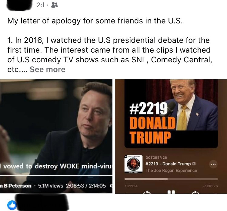 2016년 미국 대선시, 난 트럼프를 지지하는 친구들을 반대쪽으로 회유해보려는 소통을 한 적이 있다. (당시에 그 두 명을 제외하고는 모두 힐러리 클린턴을 지지하는 듯 했다.)그 친구 둘은 내가 미국에서 지낼 때 함께 살았던 쌍둥이 형제이다. (날 거두어준 호스트 패밀리였다)