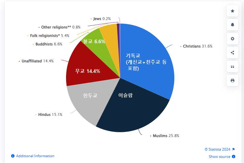 우선 무교가 전세계에서 차지하는 비중은 14.4%에 불과하다.