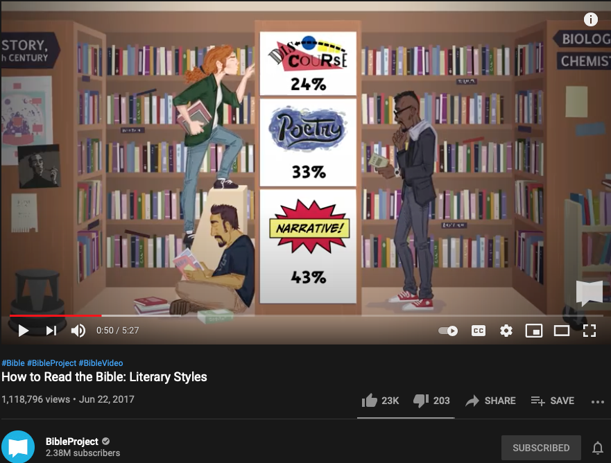 이 책들 안의 문학 장르를 크게 세 가지로 분류해서 통계를 내자면 ‘내러티브(narrative)’ 형식이 502 장(chapter)으로 43%를 차지하고, 시가(Poetry) 387장 으로 33%, 연설이나 편지같은 ‘담화(discourse)’가 300 장으로 24%를 차지 합니다.