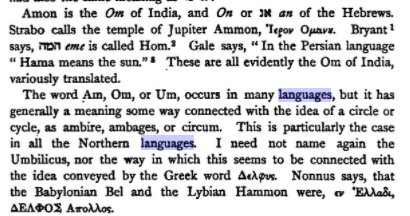 언어의 기원이라니! 언어덕후이다보니 궁금하기도 하고 저자의 분석논리 및 의식의 흐름을 좀 더 파악해보기 위해 이곳저곳 읽어봤습니다. (번역) "아몬은 인도의 '옴'이고, 히브리어의 온 혹은 안이다, .... 암, 옴, 움, 은 많은 언어에 존재하는데, 보통 원이나 사이클과 관련된다. 라틴어 ambire, ambages, circum과 같이. 특히 북방언어에 이런 경우이다. .."