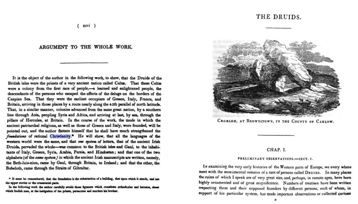 "이 작품의 주장 | 영국 제도의 드루이드가 켈트족이라는 고대 국가의 성직자라는 것을 보여주는 것이 이 작품의 목표이다. 영국해협의 드루이드가 고대 국가인 켈트의 사제들이었고, 이 켈트는 첫 인류의 식민지였다. 그 민족은 학식이 풍부하고 계몽되었으며 캐스피안海 경계에서 홍수의 영향을 피한 후손들이다. 그들은 그리스, 이탈리아, 프랑스, 영국의 초기 거주자들이었고, 거의 북위 4.5선을 따라가는 루트를 통해 그 곳에 도달한다. 비슷한 방법으로 이 식민지는 같은 위대한 국가로부터, 남쪽 선을 따라 아시아, 시리아, , 영국의 '헤라클레스의 기둥'을 따라 바다를 건너 궁극적으로 아프리카까지 도착한다. 이 작품을 통해, 고대의 족장 종교(Patriarchal religion)과 그리스, 이탈리아의 종교들이 세워진 유래를 지적할 것이며 이것이 '합리적인 기독교'의 근간을 강화할 거라고 저자는 자찬한다."