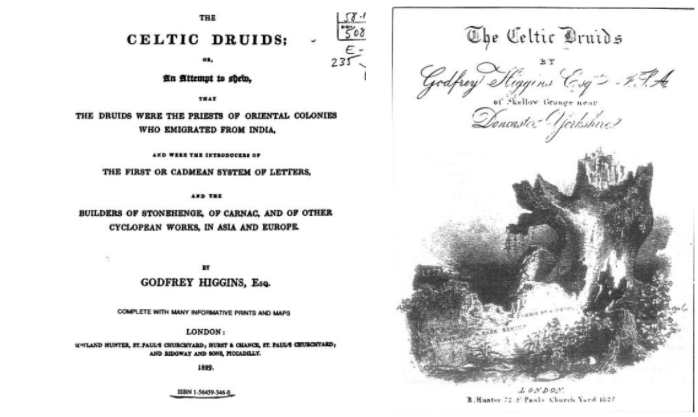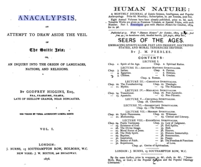 히긴스 <아나칼립시스 ANACALYPSIS> (1836) 완성시키지 못고 유작으로 남깁니다. 부제는 "이집트 이시스(Saitic Isis)의 베일을 벗기려는 시도; 또는 언어, 국가 및 종교의 기원에 대한 조사 (An attempt to draw aside the veil of the Saitic Isis; or an Inquiry into the Origin of Languages, Nations, and Religions)"입니다. 이 책을 통해 모든 종교는 인도와 아틀란티스에서 왔다는 주장을 합니다.