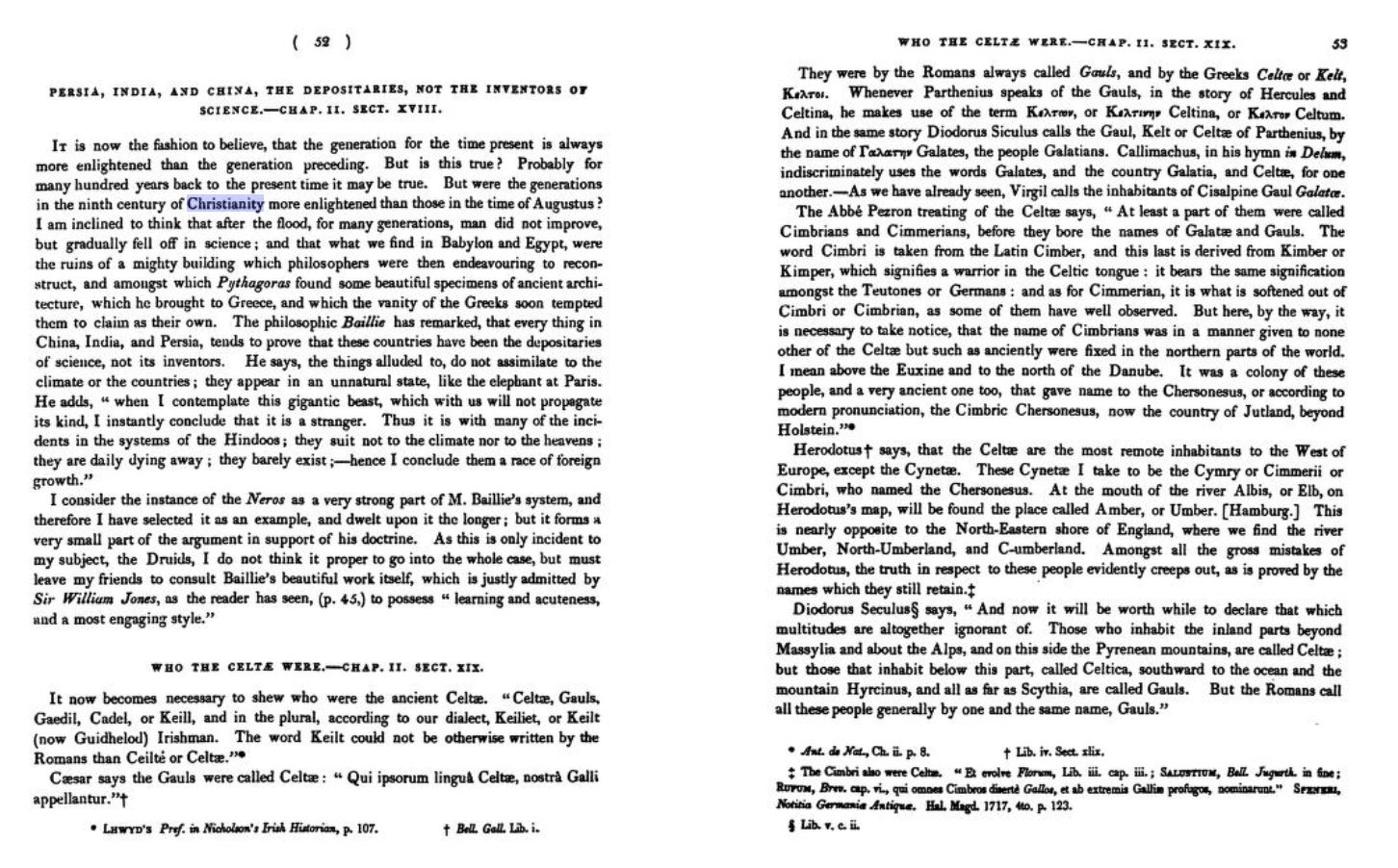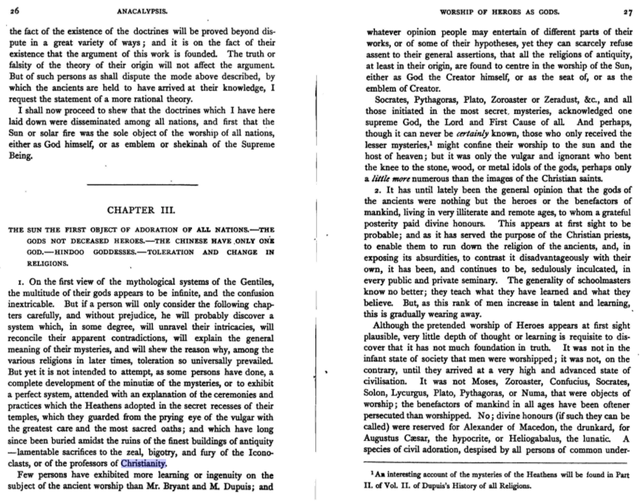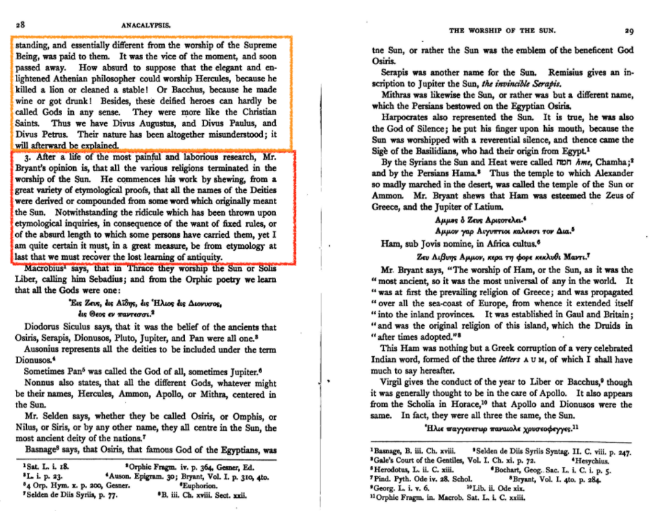 "일생을 거쳐 고통스럽고 힘든 연구의 삶을 마친 브라이언트의 의견은 모든 다양한 종교가 태양 숭배에서 종결되었다는 것입니다. 그는 신들의 모든 이름이 원래 태양을 의미하는 어떤 단어에서 파생되거나 합성되었다는 것을 매우 다양한 어원학적 증거에서 비추어 개진합니다. 어원학적 질문에 대한 조롱, 고정된 규칙의 부재, 또는 일부 사람들이 그것을 수행한 터무니없는 량의 질문이 던져졌음에도 불구하고, 나는 그것이 어원에서 나온 것이어야한다고 확신합니다. 마지막으로 우리는 잃어버린 고대의 학습을 회복해야합니다.