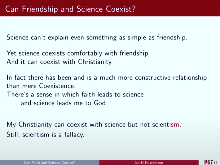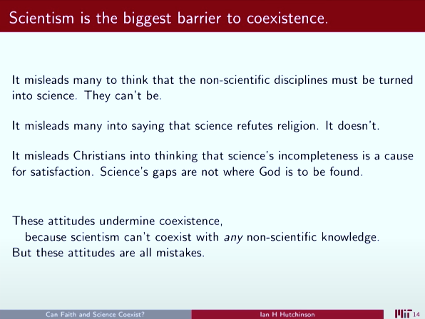 과학주의가 이 (과학과 기독교 신앙의) 공존에 가장 큰 장애물입니다. 과학주의가 과학이 아닌 다른 학문들이 과학이 되어야 한다고 오도하고 있습니다. 과학주의가 어떤 과학자들이 (자기 분야 밖에서) 도를 넘어서 과학이 종교를 반박한 척 합니다.