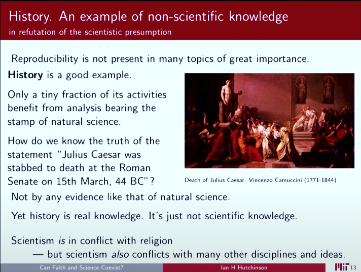 (예수의) 부활사건이나 쥴리어스 시저가 기원전 44년 로마 원로원의 계단에서 칼에 찔려 같은 역사적 주장에 대한 진실성을 입증하는 방법은 당연히 온전히 과학적 방법이 아닙니다.
