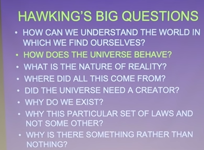 스티븐 호킹이 두번째 질문-우주가 어떻게 행동하는 가-에 대해 뭐라고 설명하는 지 들어봅시다. 그의 책에선 이렇게 말합니다.