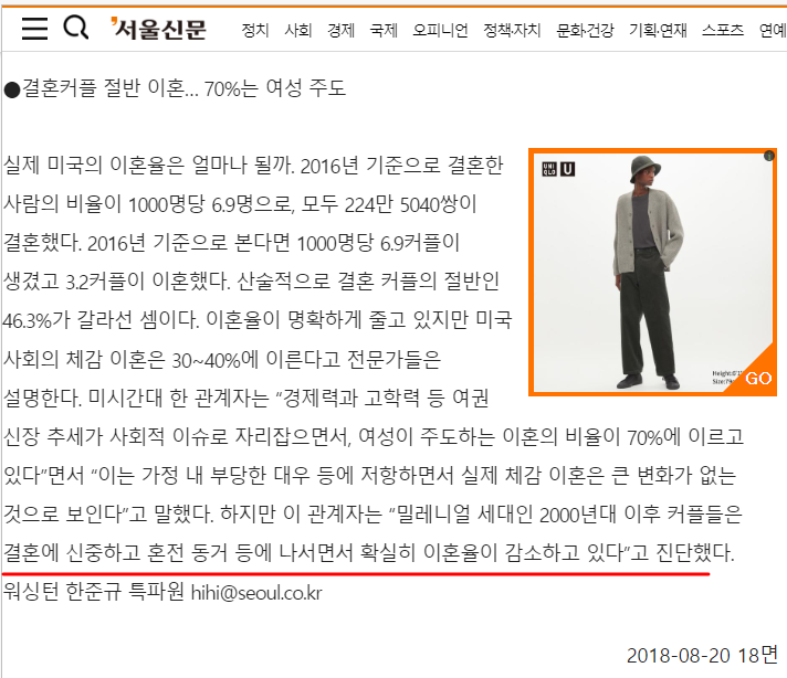 (2) 반면 아래 2018년 서울신문 기사의 경우, 이혼율이 46.3% 라는 통계수치를 인용한 후, 감소하고 있는 이혼율 (객관적인 데이터)의 원인에 대해 "전문가" / "관계자" 추측적인 해석을 더해 본인의 논점을 전달합니다.