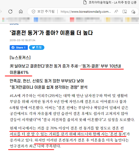 (1) 아래 2019년 신문에선 '동거-결혼' 부부 10년 내 이혼율 41% 라는 데이터를 이야기하죠.
