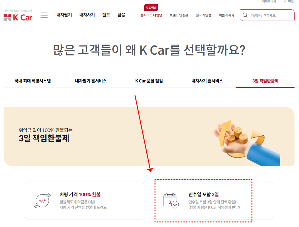 중고차 판매사업자인 케이카(KCar) 3일 동안 타보고 환불할 수 있는 옵션은 중고차 구매에 획기적인 선택지였습니다. 정직한 사업자도 있겠지만 사기를 당하는 경우도 워낙 많다보니 '리스크'를 낮추기 위한 좋은 광고 포인트가 되었었죠. (실제로 저도 그래서 여기서 차를 ...) 일단 결재해서 홈서비스로 수령한 후, 정비업체에 가져가서 문제가 없는 지 더블체크를 하는 거죠.