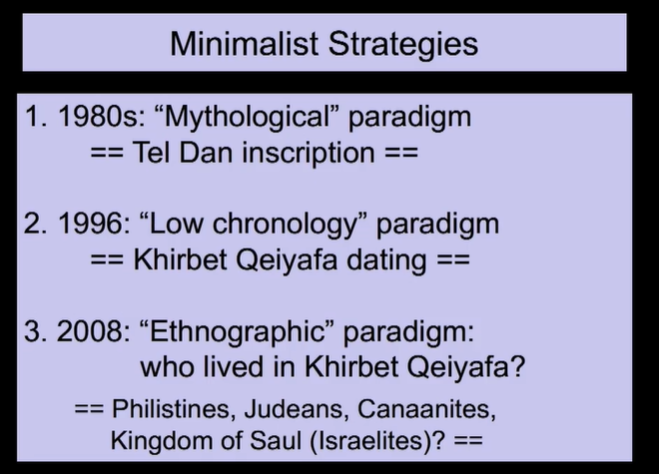 ※미니멀리스트 측 대표 저자: 텔 아비브 대학의 이스라엘 핑켈스타인 (Israel Finkelstein)의 논문을 확인할 수 있었습니다. 제목: Khirbet Qeiyafa: An Unsensational Archaeological and Historical Interpretation (2012)