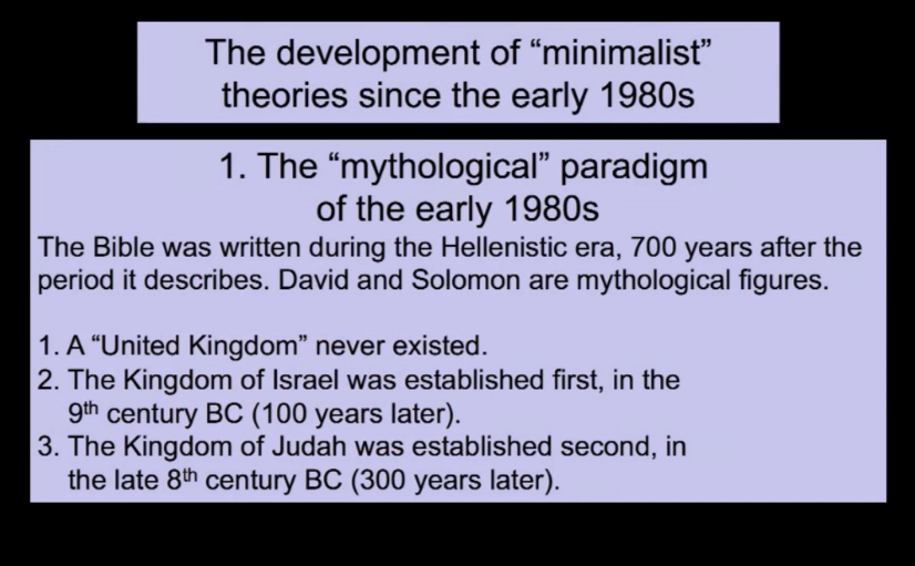 성경에 묘사된 이야기의 시점보다 700년 이후에 쓰여진 거고 다윗과 솔로몬은 신화적 존재라고 주장했죠.