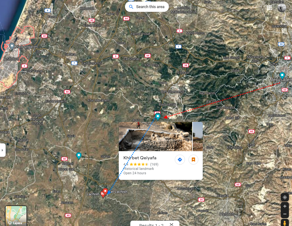라 키쉬(Lachish) 근처에 있는 히르벳 케야파(Khirbet Queyafa/키르벳 케야파)는 예루살렘으로부터 도보로 하루 걸리는 거리에 있고, 히르벳 아라이는 케야파로부터 하루 거리에 있습니다.
