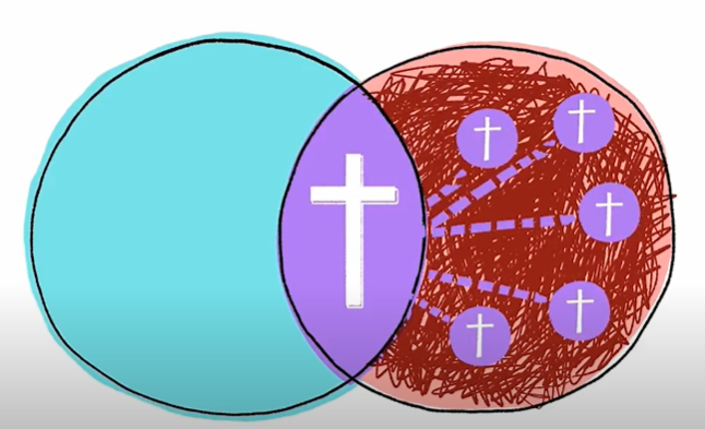 왼쪽(파란) 천국 Heaven 혹은 God-Space, 오른쪽(핑크) 이 땅 Earth 혹은 Human-space, 가운데 두 세상이 겹치는 부분 - 예수를 통해 이 땅에서 하나님 나라를 만들어 간다는 걸 이미지로 표현한 것 - 출처: bibleproject