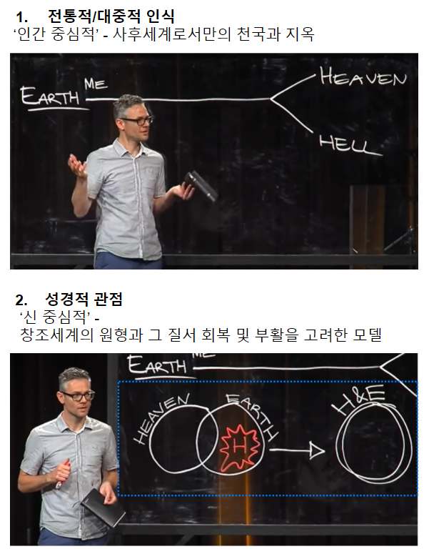 여기에 대해선 별도의 시리즈를 진행해야 충분한 설명이 가능할 것 같으니 이번 글에선 기존 관점과의 차이를 부각한 요약본만 설명하는 것으로 갈음해야겠다. 기독교 밖의 많은 사람 (그리고 일부 기독교인들)은 기독교세계관의 천국과 지옥을 '전통적인 관점'의 사후 세계로서만 이해하고 있다. 하지만 성경적인 관점을 보면 이것보다 훨씬 복잡하다.