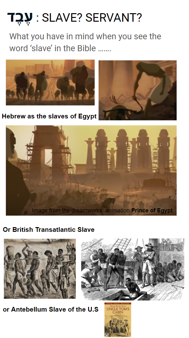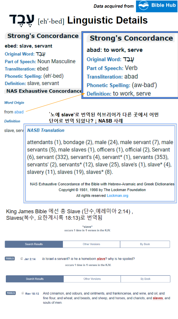 우선 '노예'로 번역된 단어의 히브리어는 עֶבֶד [ebed / eved] 이고 그 어원은 일하다의 뜻인 성경에서 עָבַד[aw-bad']에서 유래합니다.