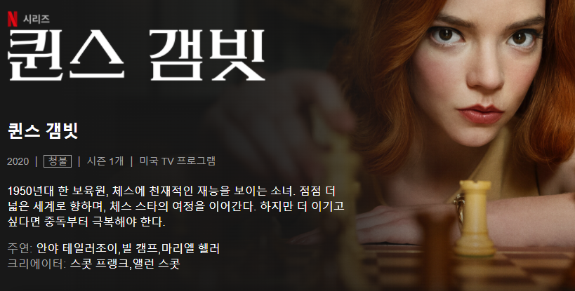 <퀸스 갬빗(Queen's Gambit)>(2020년作, 청불)은 불행한 가정 속에서 자라다가 고아가 된 아이가 재능을 발견하며 겪게 되는 이야기입니다. 체스라는 지루하게 느껴질 수 있는 주제를 인간의 내면과 관계, 그리고 중독이란 문제에 집중하며 이야기를 흥미롭게 풀어갑니다.