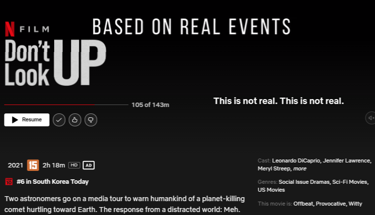 재난영화의 탈을 쓴 <돈룩업> (Don't Look Up) 은 각자 다른 방식으로 현실과 미래를 마주하는 사람들을 그린 영화 입니다.