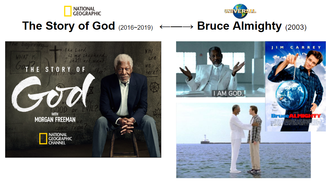 다큐멘터리 채널 하면 떠오르는 (아, 요즘은 패션브랜드인가요)내셔널 지오그래픽社의 '스토리 오브 갓(Story of God)' 에서 모건 프리먼의 신뢰를 주는 목소리는 브루스 올마이티(Bruce Almighty)의 연장선일 수 있다는 거죠.