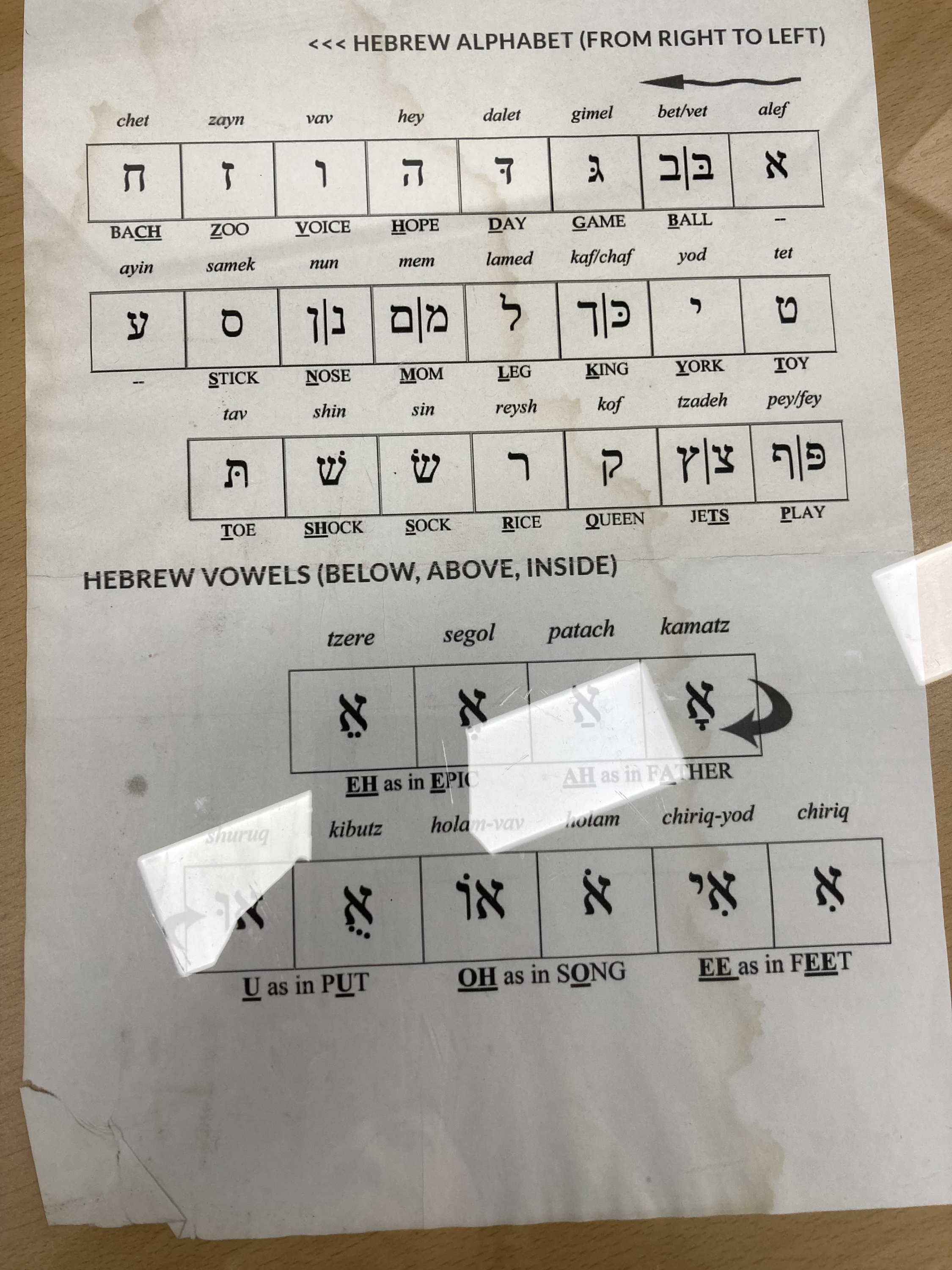 [여담] 전 신학생이 아니라 일반인이고 히브리어 전공자는 아닙니다. 한 번 배워보겠다고 회사 이러닝(E-learning) 코스에 있는 히브리어 수업을 도전했다가 통과 못하고 월급에서 까인적이 있는 게 전부입니다.. 아래 이미지가 그 때 히브리어 글자라도 외워보자고 출력해서 회사 책상 유리 안에 넣어두었던 표 입니다. (물 한 번 쏟아서 젖었던 적이 있어서 저리...'고문서 느낌'이.. ㅎㅎ)
