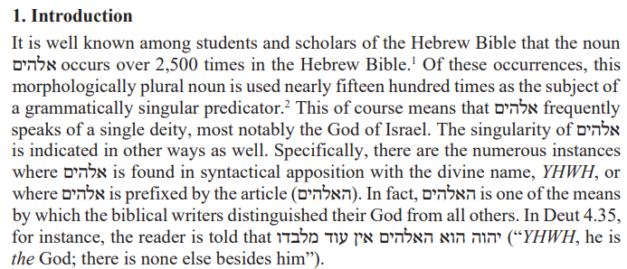 히브리 성경(구약) 2500번 이상 등장하는 '엘로힘'이란 명사, 이 '복수형 명사' (형태적으로는 복수)그 중 약 1500번은 문법적으로 단수로 사용됨. 당연히 이건 '엘로힘'이란 단어를 이스라엘의 신(하나님), 단일신이라는 걸 의미함. 그 엘로힘이 다른 의미로 사용되기도 함.