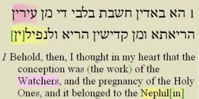 In his book Stairway to Heaven, Sitchin quotes from a Dead Sea Scroll called the Genesis Apocryphon 110-112. In an effort to defend his idea that the nephilim and the sons of God are the same, he writes: "But as we examine the Hebrew original, we find it does not say 'watchers'; it says 'Nephilim'." The quotation shows that Sitchin did not know the Qumran text was written in Aramaic, not Hebrew, and he also mistranslated it, for the word "Watchers" is actually in the text he quotes AND has pictured in his book! To the right is an image of the transcription of the passage in Sitchin's book and a translation. Both come from The Dead Sea Scrolls Study Edition Vol. 1:Q1-4Q273 - Vol II: 4Q274-11Q31 CD , ed. by Florentino Garcia Martinez and Eibert J. C. Tigchelaar, scrolls specialists (our text is in volume 1). The pink word is the word for "Watchers" and the yellow word is the word Sitchin notes in his quotation, "nephilim." Sitchin either did not know the word "Watchers" was indeed in the text, or left it out of his discussion. Since BOTH words appear in his transcription in his book, I'm not sure which is the case.