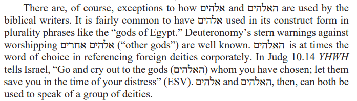 관사를 붙이지 않은 엘로힘과 관사를 붙인 엘로힘과 모두 '복수의 신들'을 얘기할 때 사용될 수 있음.