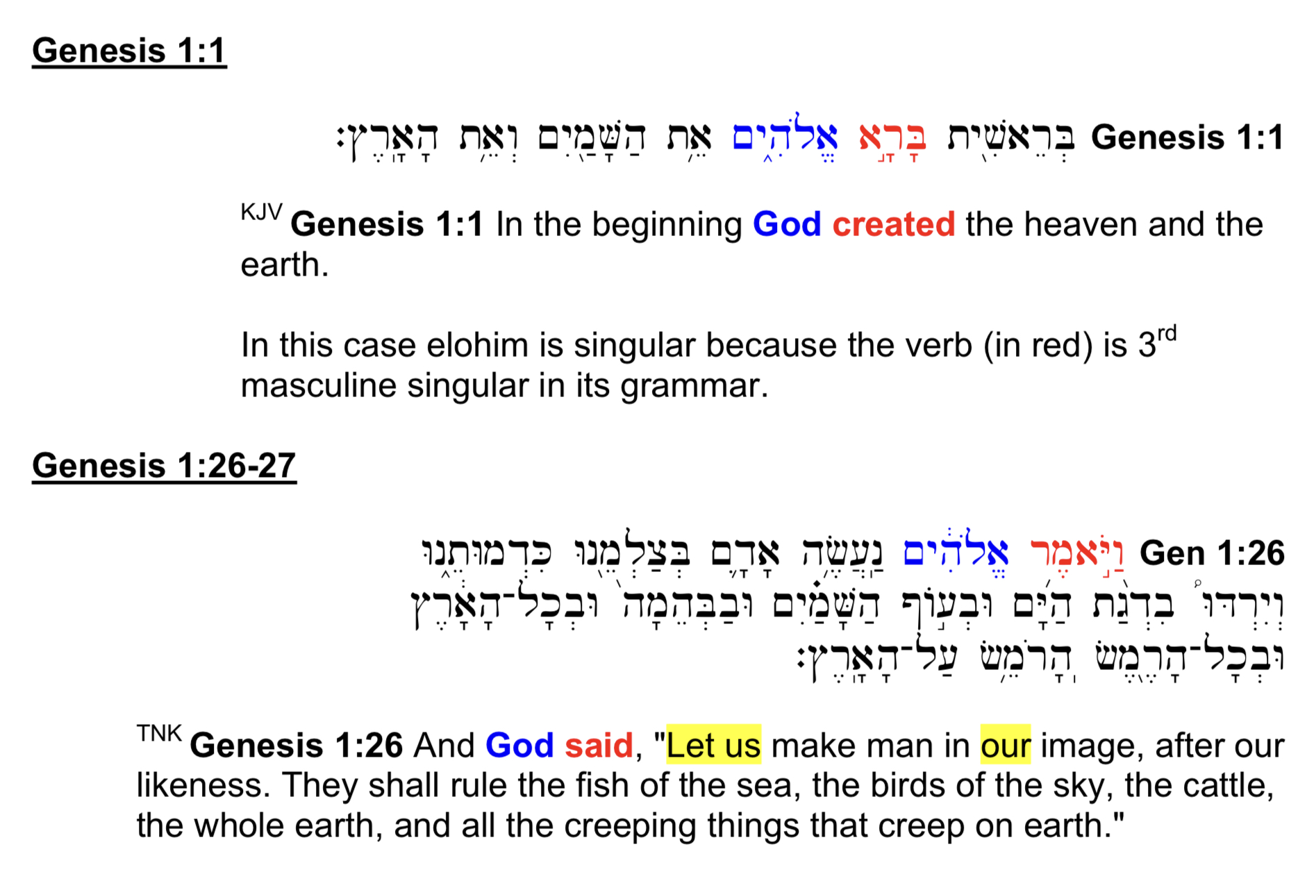 이 모든 건 다 기초 문법이고 모든 언어에는 문법이 있죠. 성서 히브리어 역시 '엘로힘'이 단수를 말하는 지 여럿을 말하는 지 알려주고 있죠. 명사 엘로힘이 단수 동사 혹은 복수 동사와 같이 사용되는 지, 단수 대명사와 복수 대명사를 사용하는 지 통해 알려줍니다.