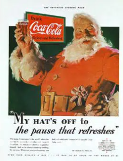 우선 우리가 산타하면 떠오르는 이미지. 빨간 옷에 풍채좋고 푸근하게 생긴 산타클로스는 20세기초 미국 코카콜라 광고에서 시작되었습니다.