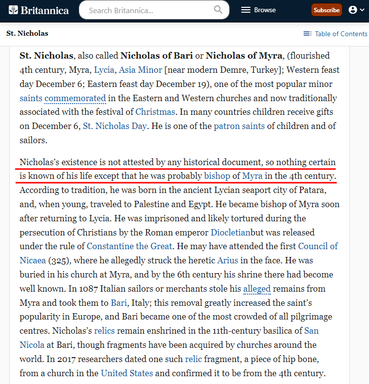 전승에 따르면 성 니콜라스, 바리(Bari)의 니콜라스, 혹은 '마이라(Myra)'의 니콜라스는 4세기 소아시아 (지금의 터키 지역)의 인물이었습니다. 역사적 문헌에 기록되진 않았지만 브리태니커 백과사전에서는 '마이라Myra의 주교Bishop 이었을 것이다'라고 표현합니다.