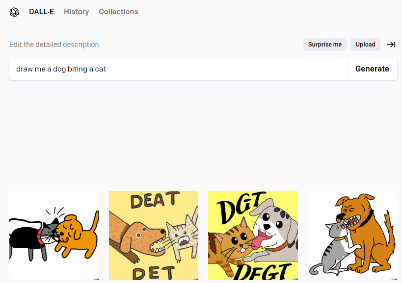 결과: 고양이에게 뽀뽀해주는 멍멍이 그림, 대치 중인 개와 고양이 그림, 사이좋은 개와 고양이 그림, 고양이를 무는 것 같은 멍멍이 그림으로 보이는 그림 하나