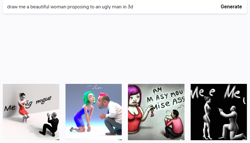 결과: 4개의 그림 중, 3개의 그림 모두 남자가 여자에게 프로포즈하는 그림을 생성. 한 개는 의미불명.